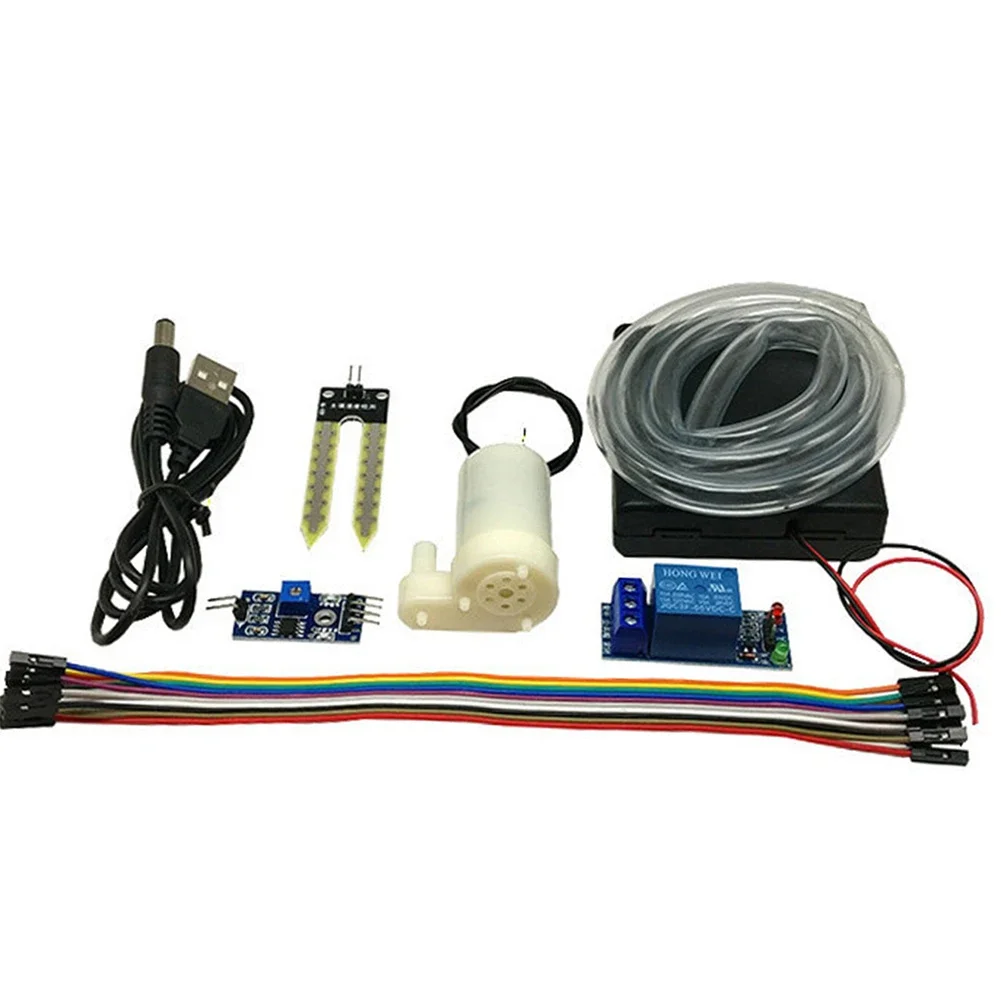 Automatic Irrigation Module DIY Kit Automatic Irrigation Garden Kit Soil Moisture Sensor Relay Module Mini Water Pump 50cm Hose for Arduino Feature: 1.Comprehensive and User-friendly Kit: This automatic irrigation module diy kit includes everything you need and is designed for easy and simple use, making it convenient for beginners and DIY enthusiasts alike. Get started quickly with all the essentials at your fingertips. 2.Safe and Reliable with Zero Risk: Rest assured that this automatic watering kit is built with safety in mind. It has undergone rigorous testing to ensure that it can be used without any risks or hazards, allowing you to work confidently and worry-free. 3.Perfect for Beginners and DIY Enthusiasts: Whether you're just starting out or an experienced DIY enthusiast, this watering system kit is tailored to meet your needs. It provides the tools and resources necessary for both learning and unleashing your creativity. 4.Compact Size with Powerful Functionality: Despite its small size, this automatic irrigation garden kit offers powerful functionality. Each piece of equipment is carefully selected to maximize efficiency and performance, ensuring that you have all the tools you need in one compact package. 5.Exquisite Craftsmanship: Crafted with meticulous detail and precision, this soil moisture detection set showcases superior craftsmanship. Every component is made with high-quality materials to ensure durability and longevity, providing you with a reliable and long-lasting solution.