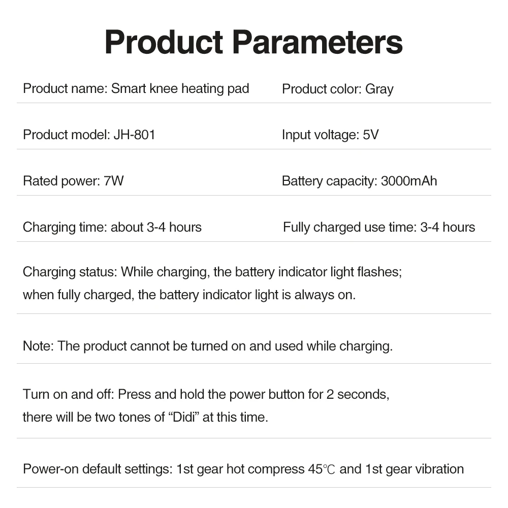 Power-on default settings: 1st gear hot compress 45℃ and 1st gear vibration