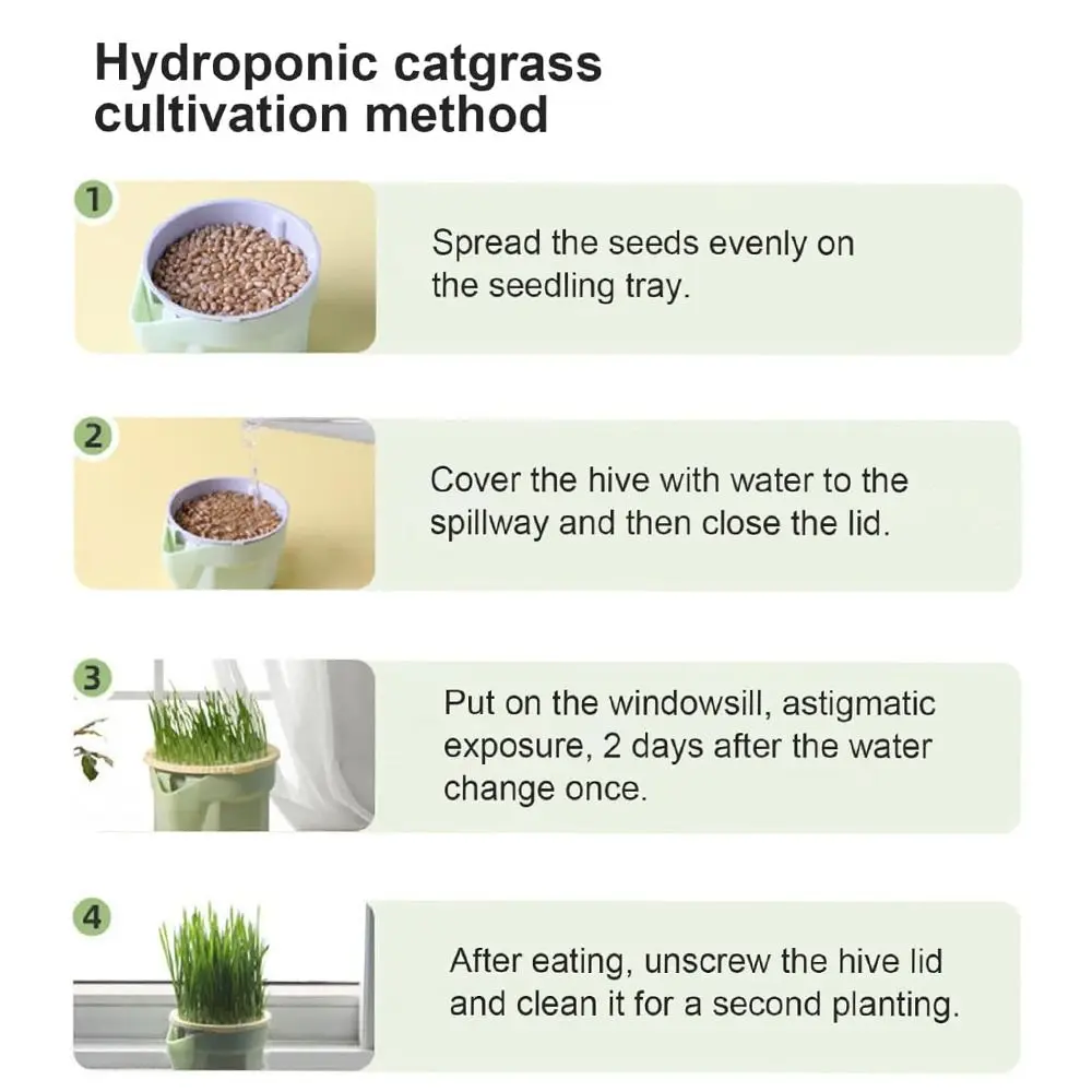 Simple Planting: Simply spread cat grass seeds(not included) evenly on the seedling tray, cover the hive with water to the spillway and then close the lid. Then put it on the windowsill, change water once after 2 days, and these seeds will grow.