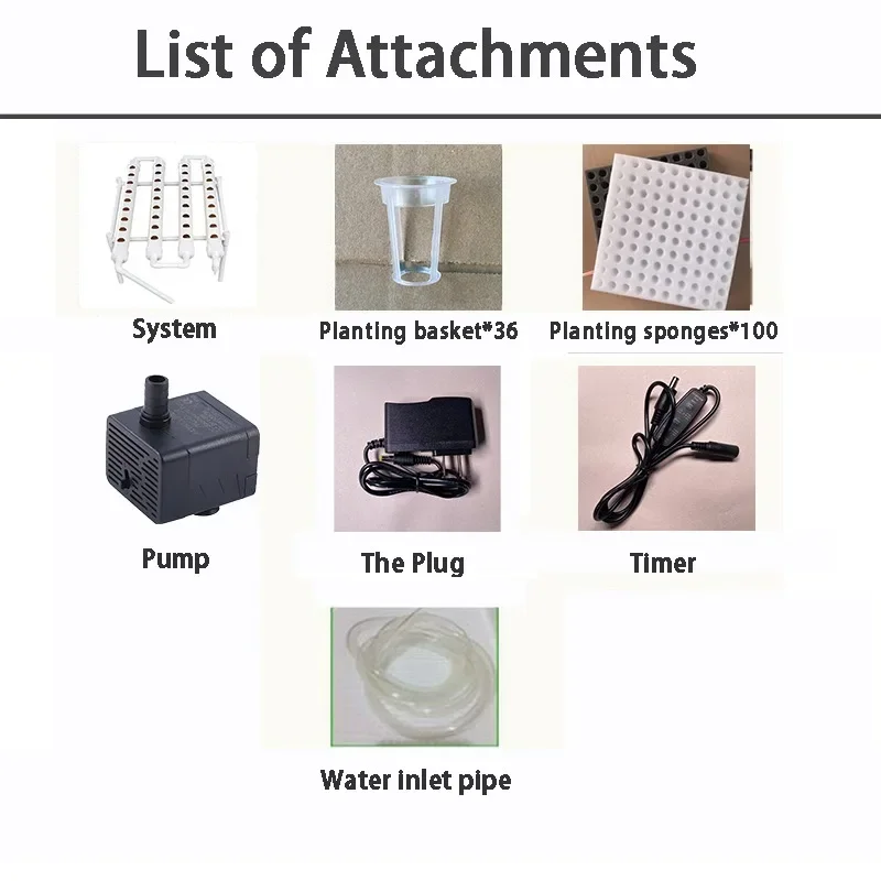 Packaging accessories: hydroponic pipeline * 1, water pump * 1, plug * 1, timer * 1, planting basket * 36, planting sponge * 1 piece (100 pieces), installation manual * 1