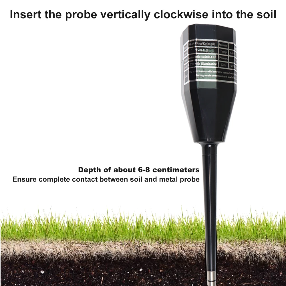 3. ①quick testing: Water the soil with distilled water before testing. Make sure the water can go 10 cm deep the least. Best humidity is 70%-80%. Insert the metal probe into soil vertically and clockwisely, to about 6-8 cm deep. Make sure the soil has thorough contact with metal probe. After about 6 seconds, the tester will display the measured value.Tightness of soil will affect measuring result. Multiple tests at the same and different points should be performed and take the average as final result.