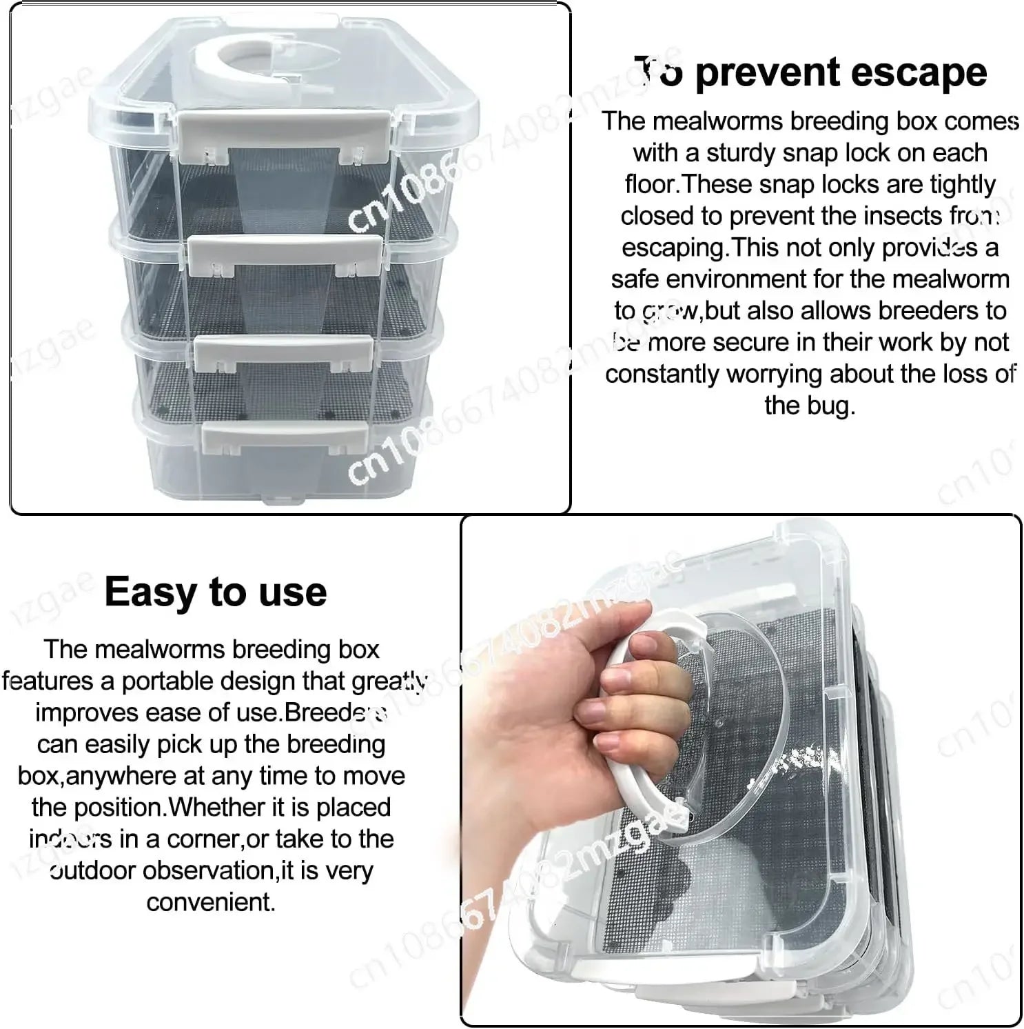 1.To prevent escape:The mealworm breeder kit comes with a sturdy snap lock on each floor. These snap locks are tightly closed to prevent the insects from escaping. Breeders are more comfortable with their work because they don't have to worry about bugs getting lost all the time.
