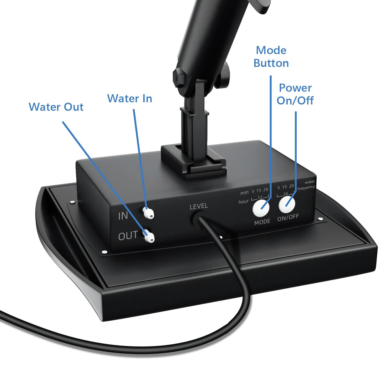 【Automatically Alarm】When the water pump is idling, the system will alarm (the buzzer sounds twice per minute), and the green indicator light located at the MODE button will flash. The cause of this failure may be that the water pump or the filter is blocked, please clean them; it may also be that there is no water in the water source container, please add water.