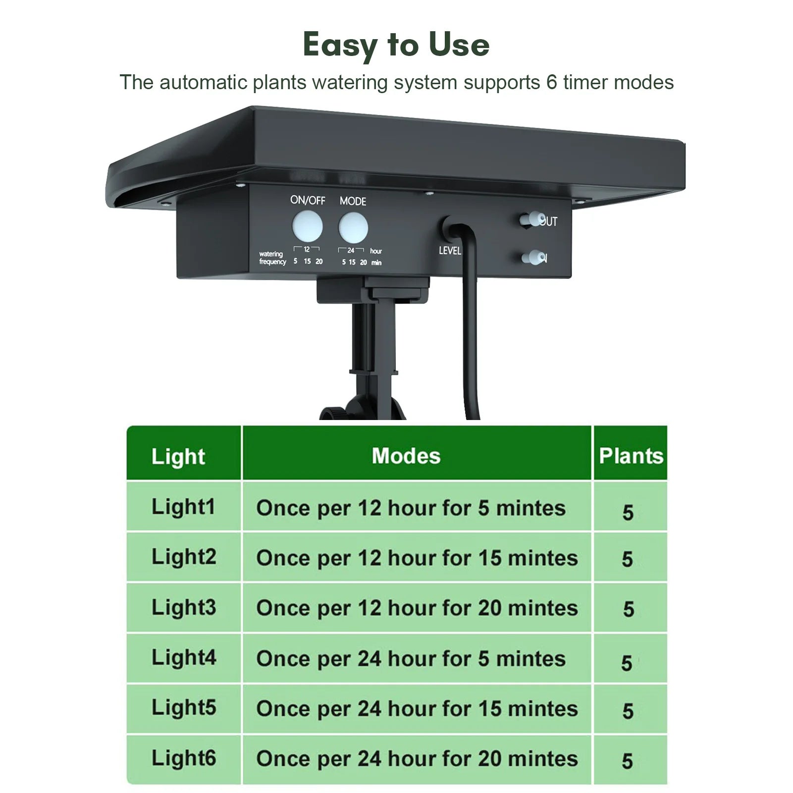 【6 Timer Modes for Easier Use】The automatic plants watering system supports 6 timer modes. Press the MODE button to select the watering frequency. For example, the blue indicator light which is in the first position (upper shows 12, lower shows 5), it means that the product will water once for 5 minutes each every 12 hours, very easy to use.