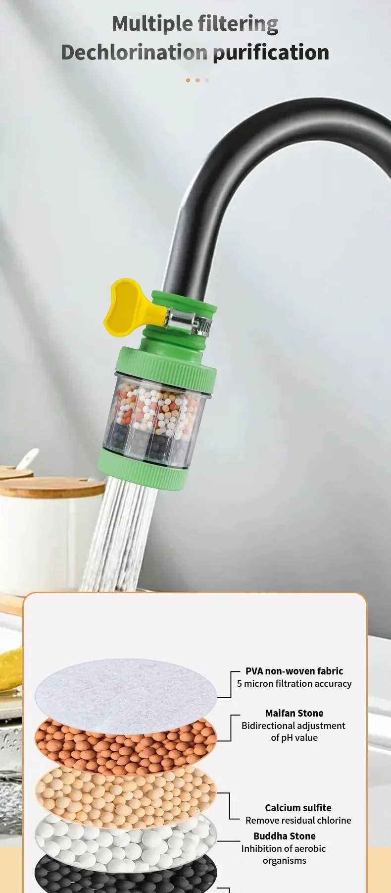 Features:Five layer filtration effectively removes residual chlorine and heavy metals from water, blocking some bacteria.